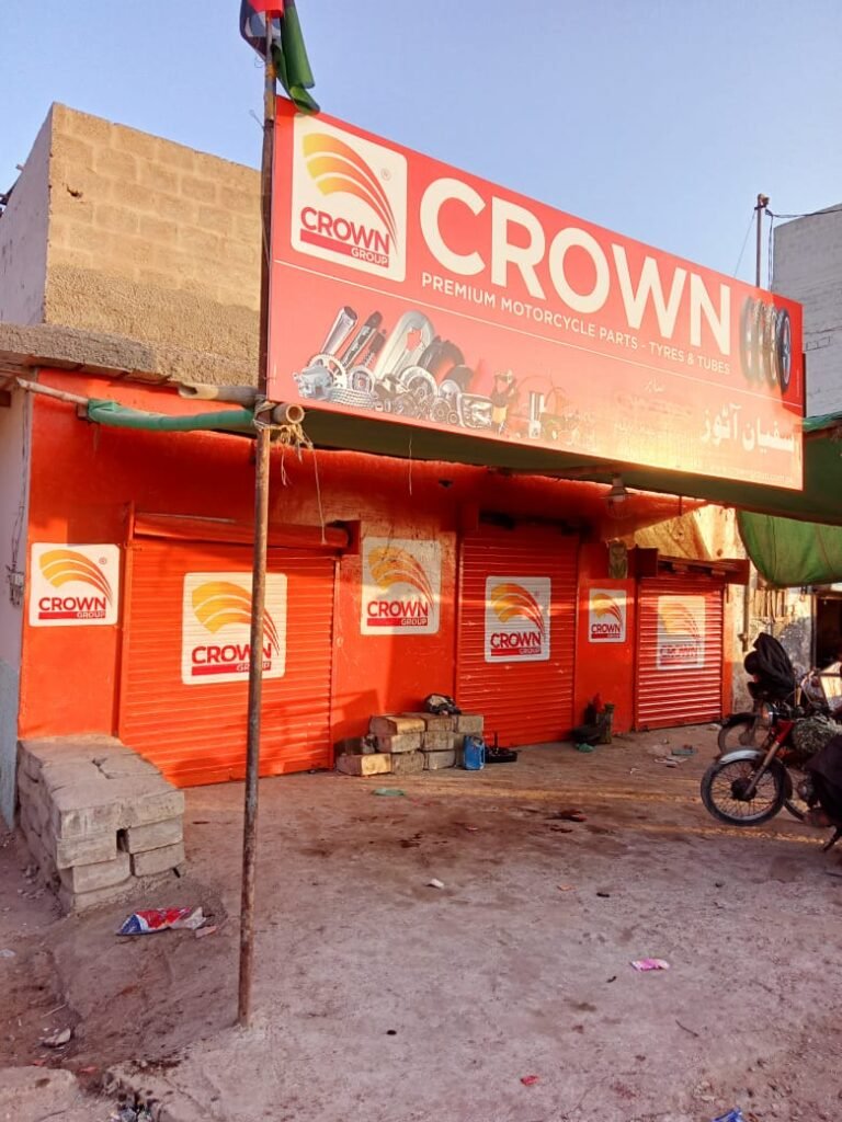 Complete outlet branding solution for Crown Group’s motorcycle parts retail location, featuring vibrant exterior painting, signage installation, and shutter branding to create strong street presence and brand visibility.