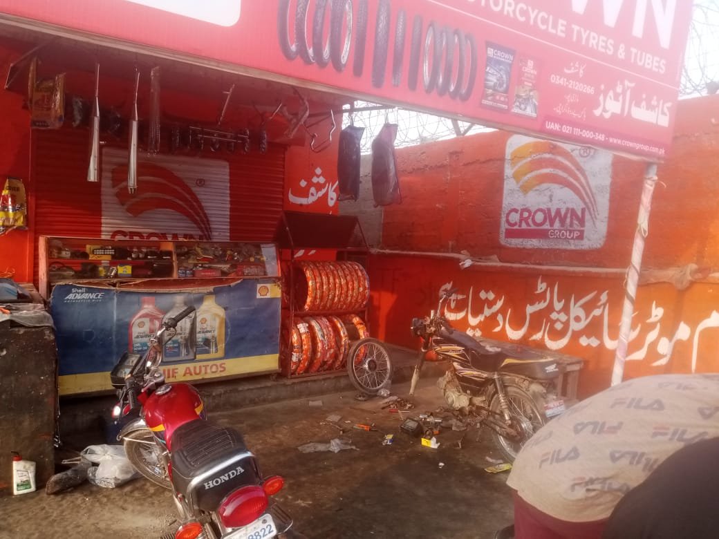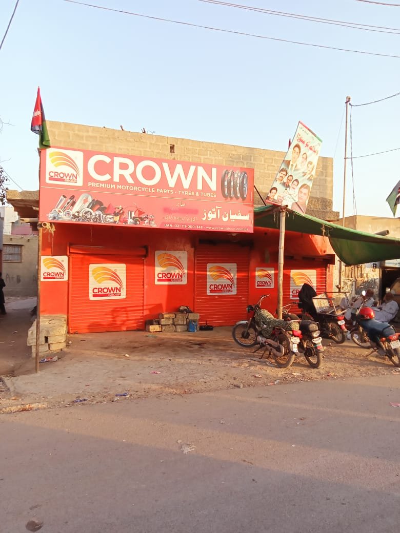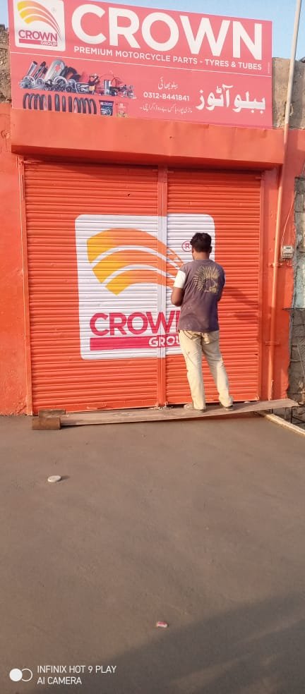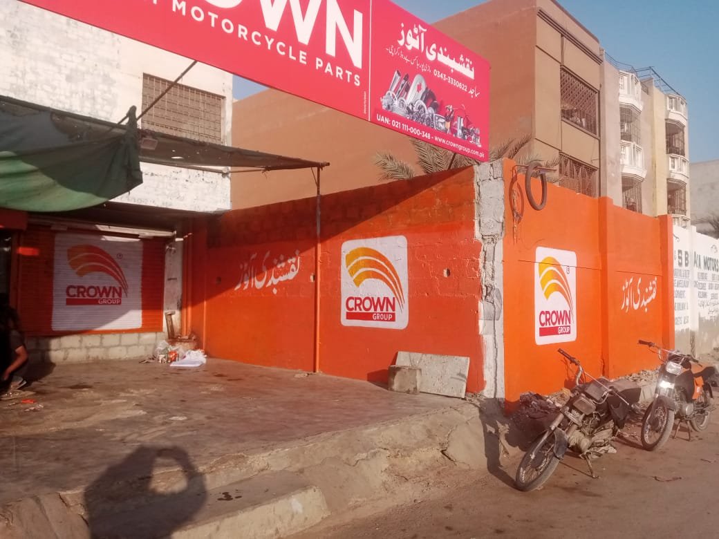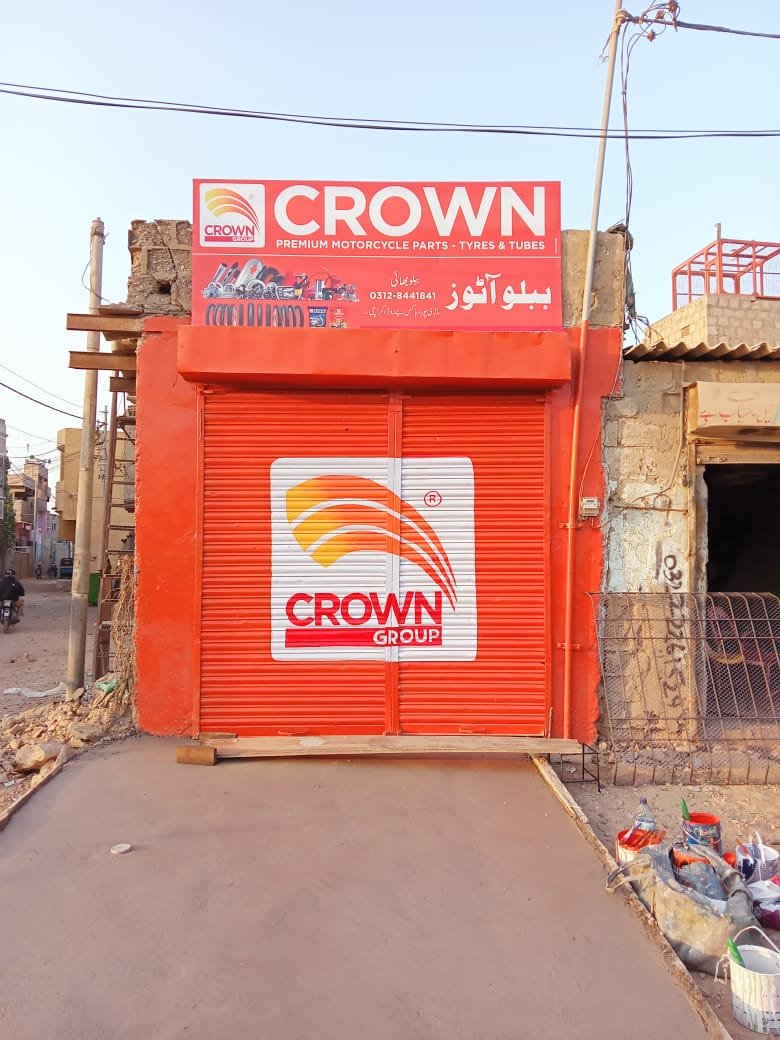 Complete outlet branding solution for Crown Group’s motorcycle parts retail location, featuring vibrant exterior painting, signage installation, and shutter branding to create strong street presence and brand visibility.