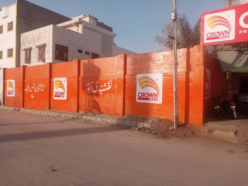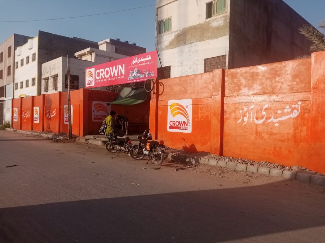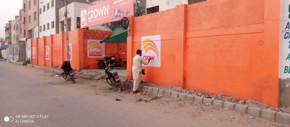 Bold color application and professional execution helped Crown Group’s outlet stand apart from competitors, creating a modern, trustworthy appearance that communicates quality and reliability to potential customers in the motorcycle parts segment.