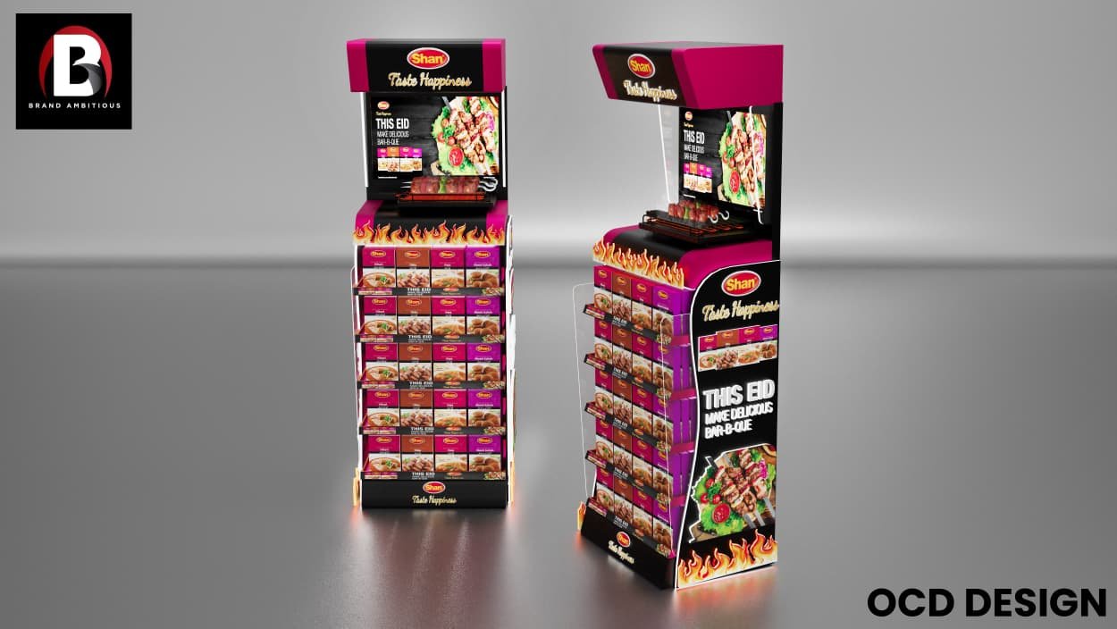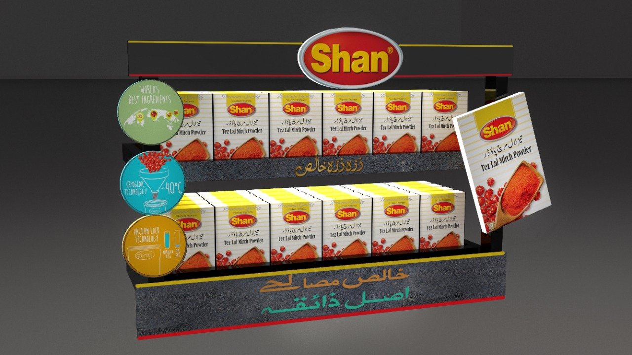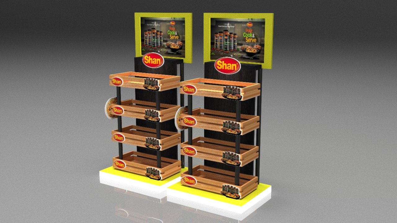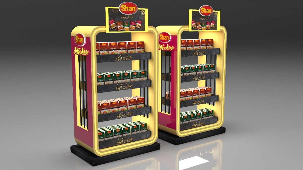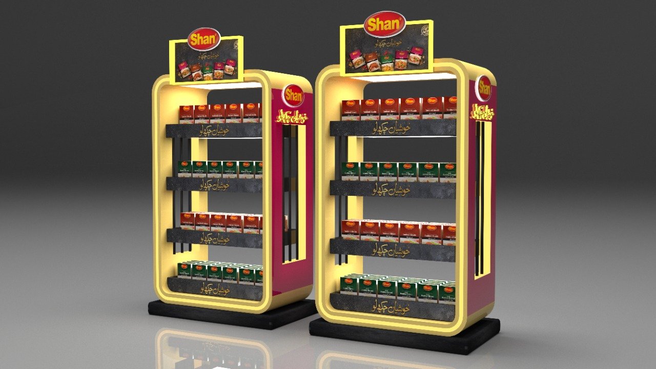 Custom-designed 3D display units and retail merchandising solutions for Shan Foods, creating eye-catching point-of-sale setups that maximize product visibility and drive sales across retail outlets nationwide.
