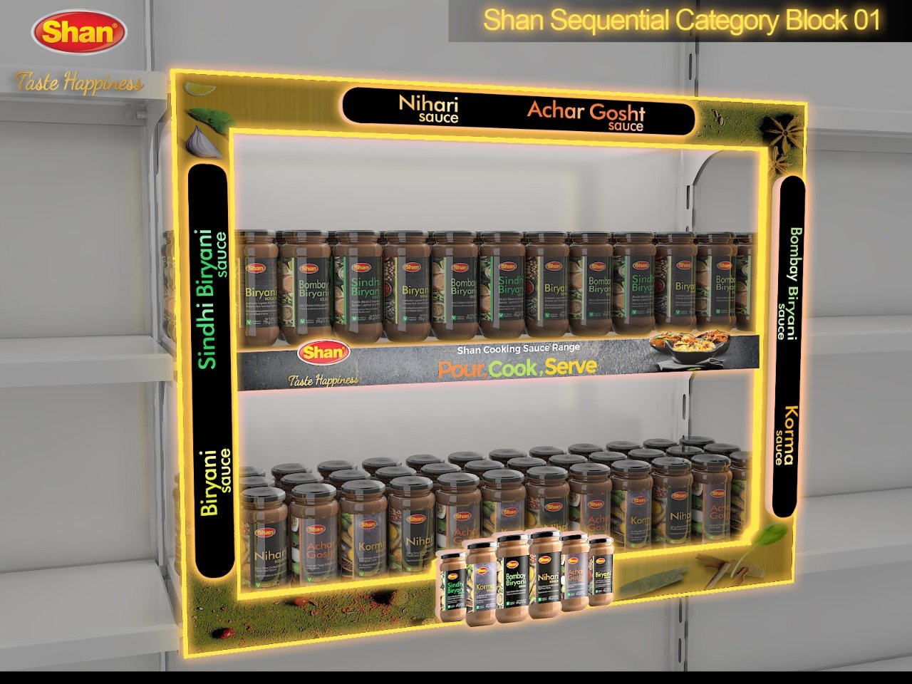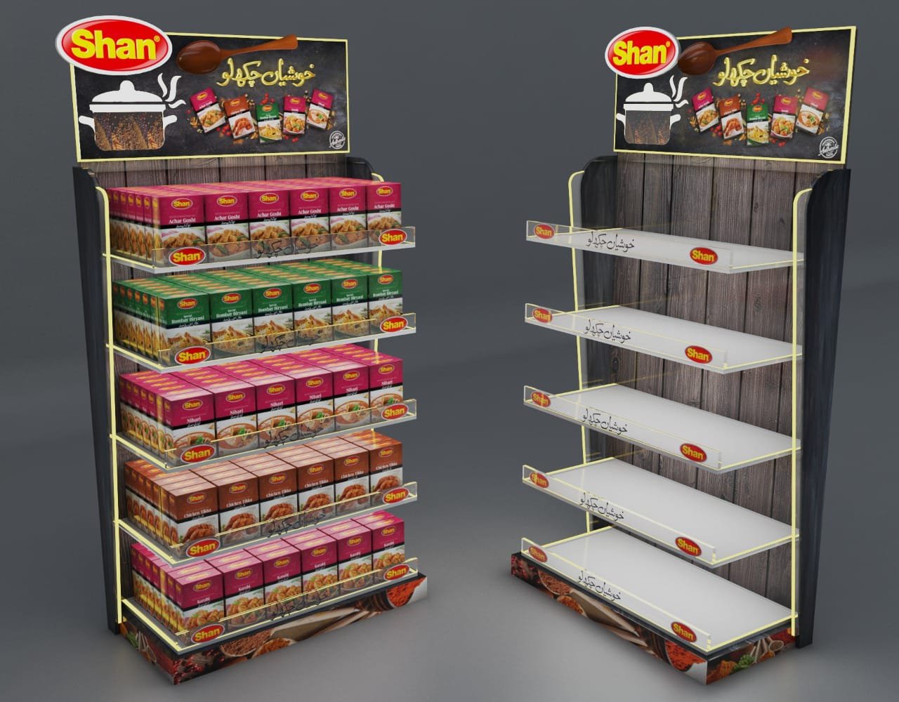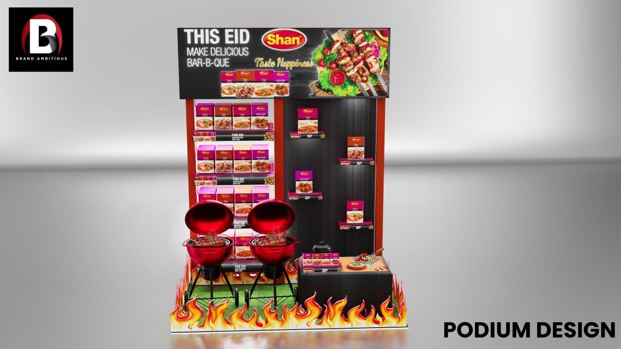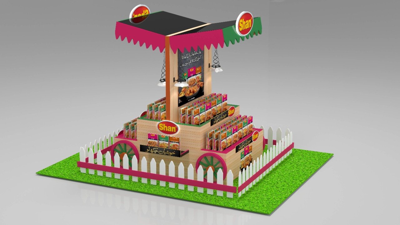 Custom-designed 3D display units and retail merchandising solutions for Shan Foods, creating eye-catching point-of-sale setups that maximize product visibility and drive sales across retail outlets nationwide.